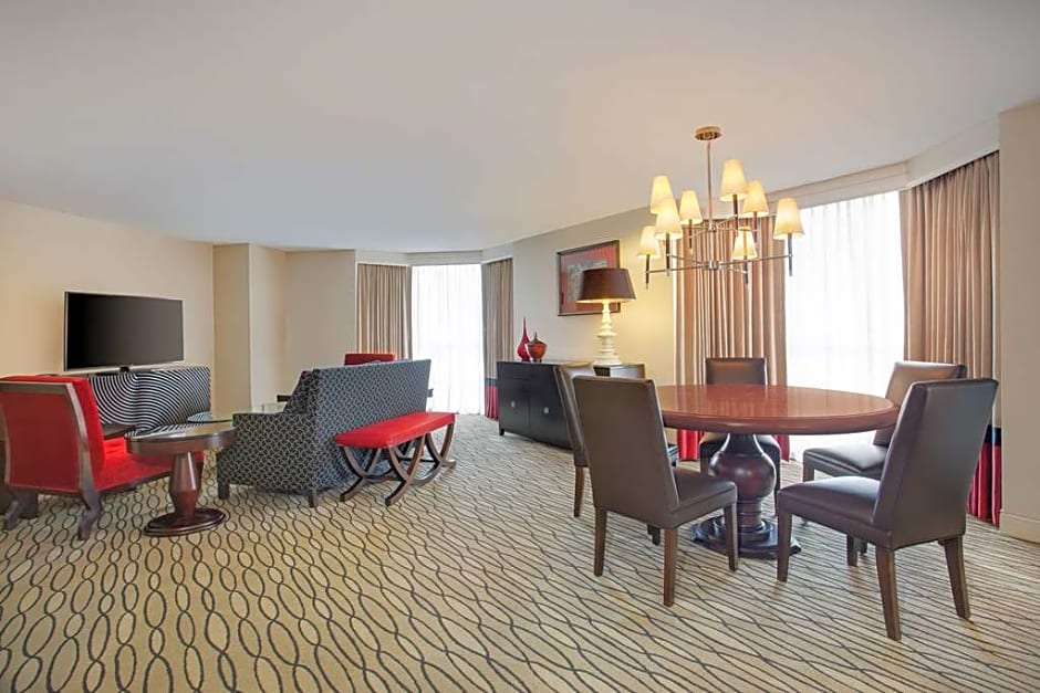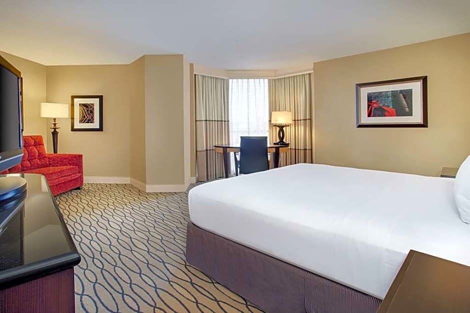 This hearing accessible room features one king bed. The room also has a visual alarm, and notification devices for the doorbell or door knock and incoming telephone calls. Upgrade to over 403 sq. ft. of spacious living quarters. Room features include: stunning floor-to-ceiling bay windows, black-out curtains, coffeemaker, work-desk, wired or wireless Internet (complimentary in public areas), down-comforter & duvet, custom mattress set, 37-inch HDTV, and in-room premium HD movie selections. All guests will also enjoy complimentary extras such as (scheduled) airport shuttle service, fitness center, pool & 24-hour business center access. Note: any corresponding photo may not reflect the specific accessible room type or room feature.